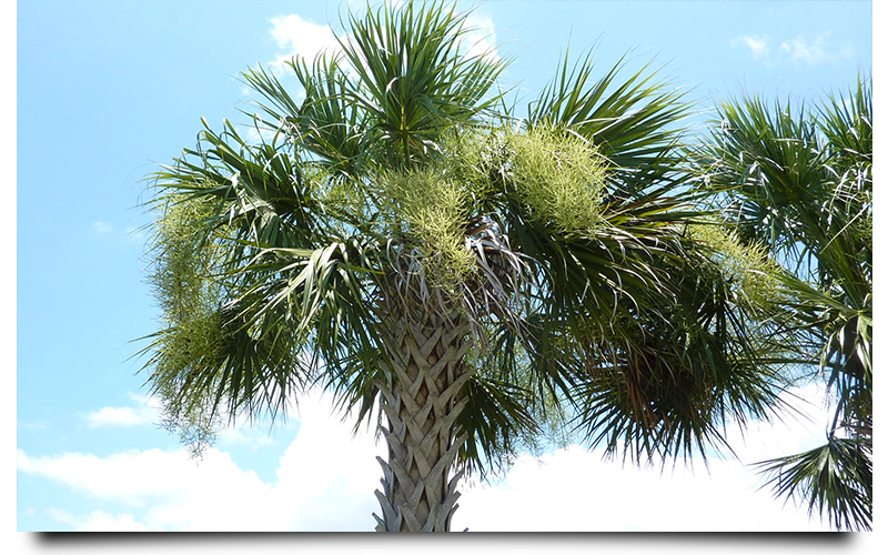 The Cabbage Palm Tree is native to North America. The Cabbage Palm has a single, gray, un-branched trunk covered with old leaf bases, also known as boots. Leaf bases create a crise-cross pattern. It gets smoother as the palm matures. Trunk is about 10 - 15 inches in diameter.